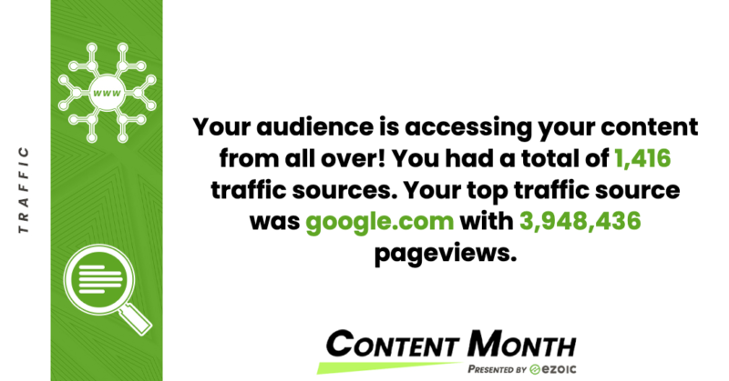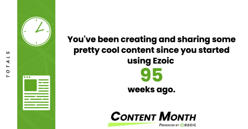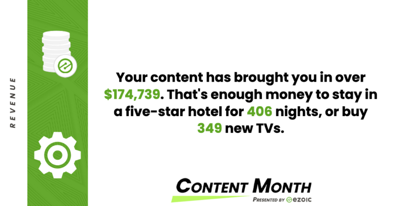 We’ve logged our aforementioned case study domain’s earnings each month, which you could check out by clicking on that handy Revenue Reports tab up top. Going back month by month, we’ve grown by leaps and bounds over the past (nearly) couple of years. But going through all that data may be a bit of a chore, so Ezoic handily did it for us instead, in conjunction with its Content Month initiative.