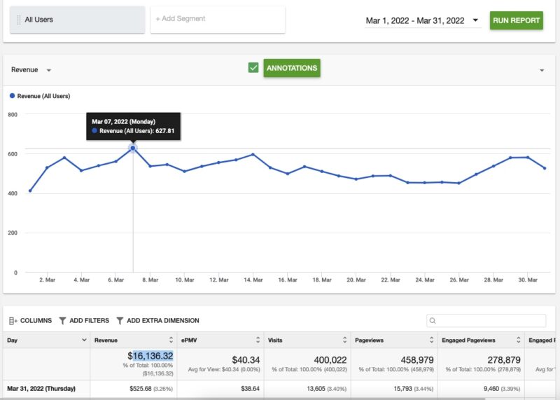 There are several noteworthy observations for March 2022. In particular, we have to look at organic traffic, which has been on an upwards trend. Once again, we’re setting new records, with more than 400,000 visits and nearly 459,000 pageviews. Among them, almost 279,000 of them were classed as ‘engaged’ pageviews. As such, it’s not surprising that our ePMV (earnings per thousand) is up to $40.