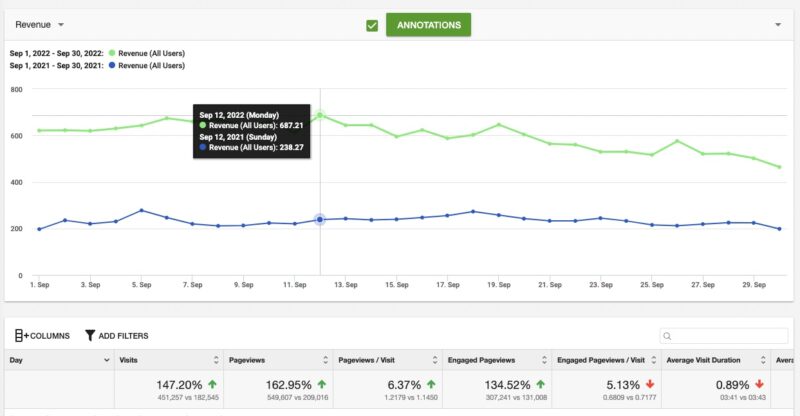 Another interesting dataset to analyze is just how far we’ve come since last year (September 2021). A good day, as of last year, would net our case study domain in the low to mid-$200s. Meanwhile, we’d be earning around $600 every 24 hours these days. That fairly significant difference does give us hope that we’re still heading in the right direction. The same goes for traffic too – far, far bigger numbers.