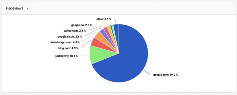 Specifically, 147%, 163%, and 135% increases in page visits, pageviews, and engaged pageviews from September 2021 to September 2022, respectively. All those analytics then leads us to another piece of data that we’ve not looked at in-depth before… Where most of our traffic is coming from. You can see in that pie chart up above that a whopping 69% of our case study domain’s traffic is routed from Google.com.