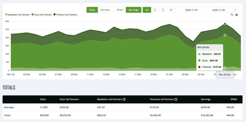 On the bright side, at least our case study domain’s EPMVs (earnings per thousand visitors) are up by 4.50% compared to October, averaging at $40.92. With that in mind, it should also be noted that our case study domain is monetized using Ezoic. As we’re a part of its Premium program, this also means that $14,319 isn’t the final tally just yet. Since, we do have to deduct those premium fees from it.