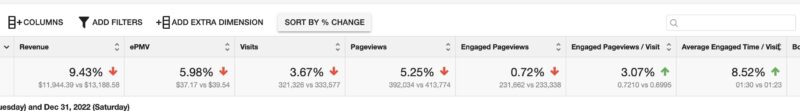 On the slightly bright side, engaged pageviews fell by under 1%. Nonetheless, that still hasn’t helped the fact that our total January 2023 ad revenues – around $11,944 – dropped by 9.43% compared to December. The other brutal figure to note is our case study domain’s EPMVs (earnings per thousand visitors), which had a 5.98% drop. Still, with an average EPMV of $37.17, at least it’s better than January 2022’s $34.37.