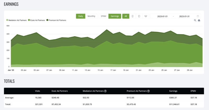 In the case of January 2023, of the $11,944 monthly total, about $1,021 came from mediation. Elsewhere, approximately $3,473 were attributed to us being a part of Ezoic’s premium program. This is where you’d get premium, high-paying, big-brand advertisers to showcase their ads on your webpage. Hence, earning more than regular ad partners. Of the latter, it makes up the rest for the month, netting us $7,352.
