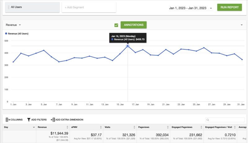 January is usually a pretty scary month for any publisher, content creator, or anyone else who’s dependent on ad revenues to make a living. With the holiday and end-year ad spending budget running dry, January’s when you’ll see advertisers pulling out left and right, causing CPMs to sink faster than a rock. As expected, our case study domain saw similar declines this past January 2023, with ad revenues of around $11,944.